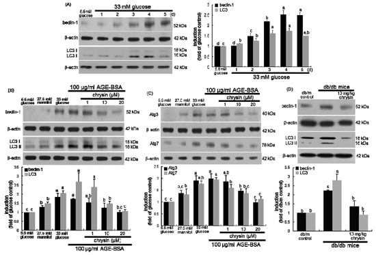 Temporal responses of cellular induction of autophagy-related proteins to high glucose (A) and inhibitory effects of chrysin on mesangial induction of autophagy-related proteins by AGE-BSA (B,C). Human renal mesangial cells were challenged for 3 days with 5.5 mM glucose, 5.5 mM glucose plus 27.5 mM mannitol as osmotic controls, 33 mM glucose or with 100 μg/mL AGE-BSA in the absence and presence of 1–20 μM chrysin. Cellular induction of beclin-1, LC3, Atg3, and Atg7 were measured by Western blot analysis with each of their primary antibodies. db/db mice were orally administrated with 10 mg/kg chrysin for 10 weeks. The renal tissue levels of beclin-1 and LC3 were also measured by Western blotting (D). The bar graphs (mean ± SEM, n = 3) in the right or bottom panels represent quantitative results obtained from a densitometer. β-Actin protein was used as an internal control. Values not sharing a letter are different at p < 0.05.