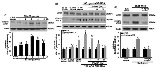 Temporal activation of mTOR to high glucose (A), and inhibitory effects of chrysin on its activation in AGE-exposed human renal mesangial cells (HRMC, B) and diabetic kidneys (C). HRMC were challenged for 3 days with 5.5 mM glucose, 5.5 mM glucose plus 27.5 mM mannitol as osmotic controls, 33 mM glucose or 100 μg/mL AGE-BSA in the absence and presence of 1–20 μM chrysin (A,B). Diabetic mice were orally administrated with 10 mg/kg chrysin for 10 weeks (C). The mTOR phosphorylation in cells and kidney tissues was measured by Western blot analysis with a primary antibody against mTOR or phospho-mTOR. The bar graphs (mean ± SEM, n = 3) in the bottom panels represent quantitative results obtained from a densitometer. β-Actin protein was used as an internal control. Values not sharing a letter are different at p < 0.05.