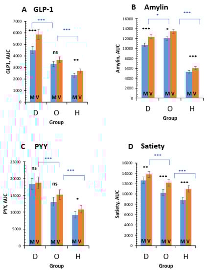 Postprandial changes in plasma concentrations of gastrointestinal hormones and in satiety in patients with diabetes (D), obese subjects (O), and healthy controls (H) after the ingestion of the processed-meat meat M-meal (M, blue) and the vegan V-meal (V, orange). Data are expressed as mean with 95% confidence intervals, using a repeated-measures Analysis of variance (ANOVA). * p < 0.05; ** p < 0.01; *** p < 0.001. (A): GLP-1: Meal: F = 19.3, p < 0.001; Group: F = 115.9, p < 0.001; Meal × Group: F = 1.2, p = 0.309; Subj (Group): F = 16.3, p < 0.001. (B): Amylin: Meal: F = 33, p < 0.001; Group: F = 469.1, p < 0.001; Meal × Group: F = 0.7, p = 0.506; Subj (Group): F = 21.3, p < 0.001. (C): PYY: Meal: F = 4, p = 0.05; Group: F = 40.7, p < 0.001; Meal × Group: F = 0.6, p = 0.532; Subj (Group): F = 17, p < 0.001. (D): Satiety: Meal: F = 25.6, p < 0.001; Group: F = 33, p < 0.001; Meal × Group: F = 0.8, p = 0.472; Subj (Group): F = 5.6, p < 0.001.