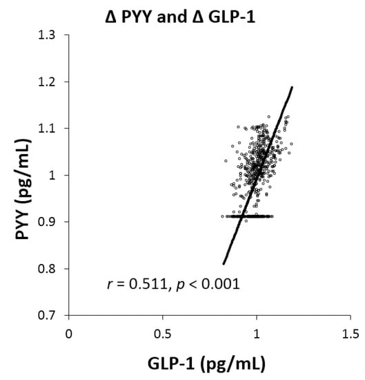 Postprandial secretion of GLP-1 increased after the V-meal in T2D (by 30.5%; 95%CI 21.2 to 40.7%; p < 0.001) and H (by 15.8%; 95%CI 8.6 to 23.5%; p = 0.01; Figure 2A). Postprandial plasma concentrations of amylin increased in all groups after the V-meal: by 15.7% in T2D (95%CI 11.8 to 19.6%; p < 0.001); by 11.5% in O (95%CI 7.8 to 15.3%; p = 0.03); and by 13.8% in H (95%CI 8.4 to 19.5%; p < 0.001; Figure 2B). An increase in postprandial values of PYY after the V-meal was significant only in H (by 18.9%; 95%CI 7.5 to 31.3%; p = 0.03; Figure 2C). Satiety was greater in all participants after the V-meal: by 9.0% in T2D (95%CI 4.4 to 13.6%; p = 0.004); by 18.7% in O (95%CI 12.8 to 24.6%; p < 0.001); and by 25.0% in H (95%CI 18.2 to 31.7%; p < 0.001; Figure 2D). A positive relationship was observed between Δ PYY and GLP-1 (r = 0.511, p < 0.001; Figure 3).