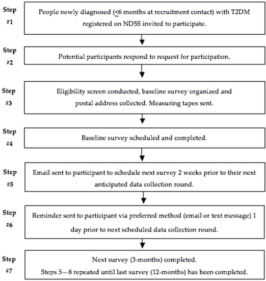 A convenience sample of all individuals registered with the NDSS with a new diagnosis of T2D over the previous 6-month period will be sent an initial invitation letter and a plain-language summary of the research project via email by Diabetes Australia. Interested individuals will be invited to contact the research team via email or telephone to confirm eligibility, provide informed consent and arrange data collection. Participants will be informed they can withdraw from the study at any stage. This recruitment method has been trialed in a feasibility study conducted in 2016–2017 (unpublished) which successfully recruited 22 participants from 1000 email invitees. Of these 22, 17 completed baseline data collection, six participants had left the study by 3 months, however all participants remaining at 3 months were retained to 12 months.