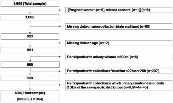 The survey took place between 15th September and 15th December 2017. From the 1008 households and individuals interviewed in the sampling frame, 639 of them (63%) provided suitable data for inclusion in the survey analysis. Originally, 6 did not meet the inclusion criteria, 99 did not provide date and time of the urine collections, 12 had missing data, 6 provided urine collections with volume less than 500 mL (conventionally taken as not plausible), 237 (23.5%) provided either under-collections (<22 h) or over-collections (>26 h) and 9 had urinary creatinine excretion outside 2 standard deviations (SDs) of the sex-specific distribution of urinary creatinine in the sample (Figure 2).