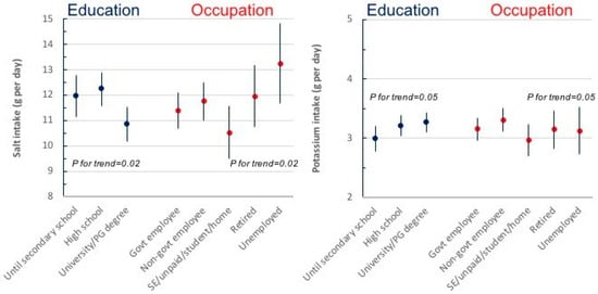 Association between salt and potassium consumption and socio-economic status, defined by educational attainment or occupation, after adjustment for age and sex (results are mean ± SD; P values for linear trend are reported).