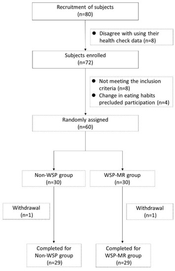 Statistical analyses were performed using SPSS (version 19; SPSS Inc., Chicago, IL, USA). For intragroup testing, we performed the paired t test with the Wilcoxon signed-rank test to compare the differences in participants’ anthropometric measurements, glycemic markers, and lipid profiles in each group. For intergroup comparisons, we performed the independent t test with the Mann–Whitney U test to compare the final values or nets between the non-WSP and WSP-MR groups. All data are expressed as means ± standard deviations (SDs). The results were considered statistically significant for p < 0.05.