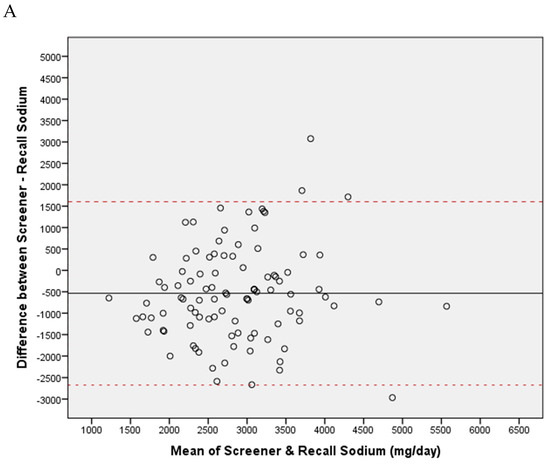Bland–Altman plots are shown in Figure 1A,B for the RD and SHoPPER samples, respectively. Bias is presented as the difference between the sodium intakes estimated by the SS© using the gender-specific equations provided and the average of three non-consecutive 24-h recalls. The mean bias between the two was −550 ± 1048 mg dietary sodium per day in the RD sample and +399 ± 1309 mg dietary sodium per day in the SHoPPER sample. This shows that, relative to diet recalls, the SS© underestimated sodium intakes reported by RDs using the ASA24© recalls and slightly overestimated sodium intakes for community adults. Limits of the agreement (± 2 SD) were similarly wide across the two study samples: ± 2096 mg/day for the RD study and ± 2620 mg/day in the SHoPPER.
