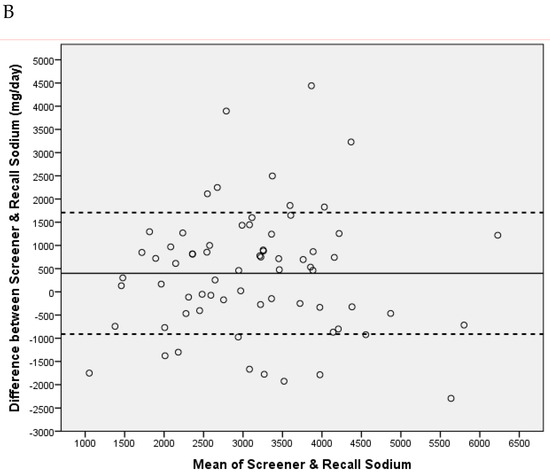 Next, concordance between sodium intakes derived from recalls with those predicted from the SS© was evaluated with Pearson correlation tests; these tests were run with de-attenuation for random error in 24-h recalls. De-attenuation was calculated based on the formula provided by Beaton et al. [6]. Finally, to obtain a visual assessment of the extent of bias between the recall and screener estimates of sodium intakes, Bland–Altman plots, as in Reference [7], were constructed.