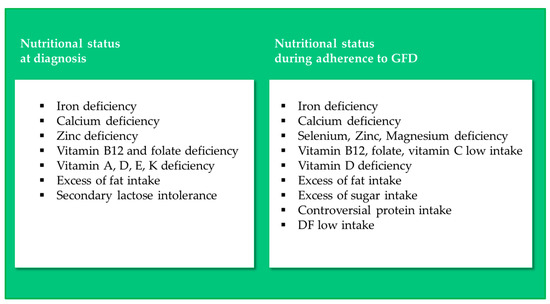 - Sue, A.; Dehlsen, K.; Ooi, C.Y. Paediatric Patients with Coeliac Disease on a Gluten-Free Diet: Nutritional Adequacy and Macro- and Micronutrient Imbalances. Curr. Gastroenterol. Rep. 2018, 20, 2. [Google Scholar] [CrossRef] [PubMed]
