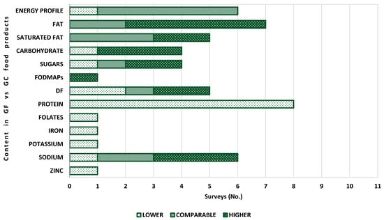 | Missbach et al. [68] | 2015 | Austria | 63 (GF) | 126 (GC) | - | Energy content, carbohydrates, total fats, saturated fatty acids, fibre and sugar did not differ between GF and GC products Protein content more than two-folds lower in 57% of all GF food categories Sodium content lower in GF products Potassium content was overall significantly lower in GF food products |