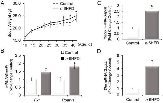An n-6HFD (diet high in n-6 fatty acids) increases body weight and increases the expression of farnesoid-X-receptor (Fxr) in mouse colonic mucosa. (A) Weaned C57/BL6 male mice (n = 6) were assigned to a control diet containing 13% energy (13%E, 5% by weight safflower oil (SO), 76% linoleic acid (LA)) or an n-6HFD containing 44 energy (44%E, 22% by weight SO) for 6 weeks. Bars represent means ± standard error of the mean (SEM) of quantitation (fold change of control) of (B) Fxr and peroxisome proliferator-activated receptorγ1 (Pparγ1), (C) ileal bile acid-binding protein (Ibabp), and (D) small heterodimer protein (Shp) mRNA corrected for glyceraldehyde dehydrogenase phosphate (Gapdh) mRNA as an internal standard. Means ± SEM (standard error of the mean) with an asterisk (*) differ (p < 0.05).