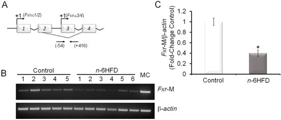 Amplification of CpG-methylated Fxr promoter amplicons from bisulfonated genomic colonic mucosal DNA was conducted in the linear range as reported previously []. The Fxr gene CpG methylation was reduced by ~60% (Figure 2B,C) in mice fed the n-6HFD, in agreement with a previous experimental report documenting increased intestinal FXR expression and BA levels as a result of feeding an HFD [].