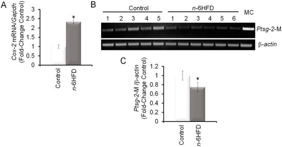 Cyclooxygenase-2 is a recognized risk factor in intestinal inflammation and CRC [,]. Levels of proximal colonic mucosal Cox-2 mRNA were increased ~1.5-fold in mice fed the n-6HFD (Figure 3A). These results were consistent with other studies showing increased COX-2 expression associated with intestinal inflammation induced by an n-6HFD [] and carcinogenesis of the colon [,]. Turning to the epigenetic regulation of the Ptsg-2 promoter (Figure 3B), feeding of the n-6HFD to C57BL/6J mice reduced CpG methylation on average by ~35% (Figure 3B,C).
