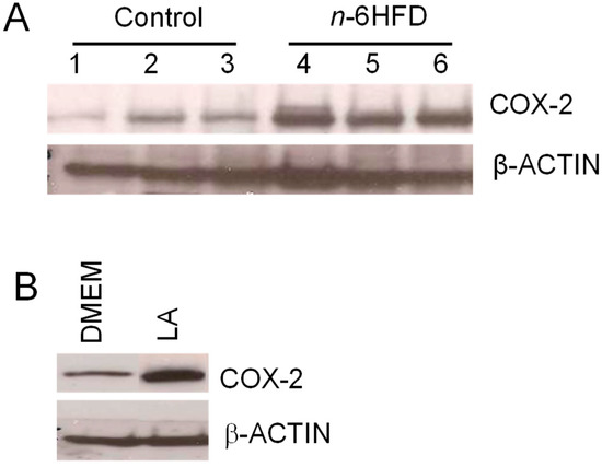 An n-6HFD induces COX-2 expression in mouse colonic mucosa. (A) The bands are representative immunocomplexes for COX-2 and internal control β-ACTIN in colonic mucosa of mice fed a control or an n-6HFD. (B) The bands are representative control immunocomplexes for COX-2 and internal control β-ACTIN from two separate experiments performed in triplicate in cell lysates of human fetal cells (FHC) cultured in control DMEM (Dulbecco’s Modified Eagle’s Medium) or DMEM plus LA (linoleic acid) (75 μM) for 72 h.