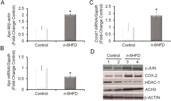 The loss of APC along with the activation of the KRAS oncogene contribute to nuclear localization of β-catenin, a component of the Wnt signaling pathway, which promotes the expression of genes involved in proliferation [,,]. An association between increased nuclear levels of β-catenin and COX-2 expression is seen in human and murine colon cancer cells with defective Apc [,]. We noted that the n-6HFD increased Apc CpG methylation (Figure 5A) while reducing the Apc transcript levels (Figure 5B) in colonic mucosa. Because the Ccnd1 gene is a direct transcriptional target for activation by β-catenin transcription complexes [,], we measured the levels of Ccnd1 transcripts and found increased expression associated with the n-6HFD (Figure 5C). The upregulation of c-JUN, whose gene is also a direct target for transcriptional activation by β-catenin [] and contributes to the activation of COX-2 [], provided a positive control for activation of the Wnt signaling pathway under conditions of diminished Apc expression (Figure 5D). Finally, we noted that the n-6HFD reduced the colonic levels of histone deacetylase-1 (HDAC-1) while increasing the expression of acetylated histone 3 (ACH3), suggesting effects on epigenetic regulation.