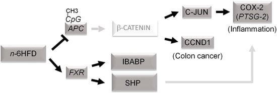 In summary, the current study provides evidence that an n-6HFD contributes epigenetically to the activation of FXR expression via CpG demethylation to support the expression of genes whose products (i.e., SHP, IBABP) participate in the regulation of BA homeostasis through the enterohepatic circulation (Figure 6). Our data also suggest that chronic exposure to an n-6HFD downregulates APC expression via CpG hypermethylation and this associates with increased expression of COX-2 via PTSG-2 CpG hypomethylation and accumulation of C-JUN and CCND1, thus increasing the risk of inflammation and cancer of the colon.