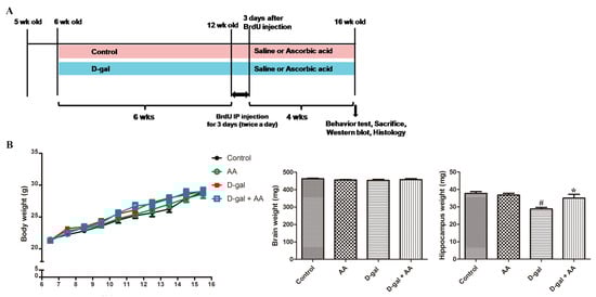 Experimental design (A) and changes in body and brain weights (B) in control, D-galactose (D-gal), ascorbic acid (150 mg/kg; AA), and ascorbic acid (150 mg/kg)-fed D-gal (D-gal + AA) groups (n = 27 per group). 5-bromo-2′-deoxyuridine (BrdU) was intraperitoneally (IP) injected. # p < 0.05, indicating a significant difference between control and D-gal groups. * p < 0.05, indicating a significant difference between D-gal and D-gal + AA groups. Data are presented as means ± SEM. wk: week.