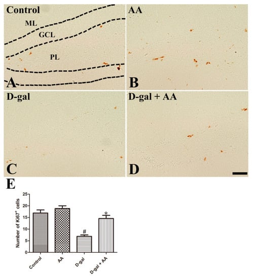 Immunohistochemistry for Ki67 in the dentate gyrus in control (A), ascorbic acid (AA) (B), D-galactose (D-gal) (C), and ascorbic acid (150 mg/kg)-fed D-gal (D) groups. Ki67-positive nuclei are observed in the subgranular zone of the dentate gyrus (arrows). Note that numbers of Ki67-positive nuclei significantly decrease in the D-gal group, and ascorbic acid treatment significantly increases cell proliferation in the D-gal + AA group. GCL, granule cell layer; ML, molecular layer; PL, polymorphic layer. Scale bar = 50 μm. (E) The number of Ki67-positive nuclei in the subgranular zone of the dentate gyrus (n = 10 per group; # p < 0.05, indicating a significant difference between control and D-gal groups; * p < 0.05, indicating a significant difference between D-gal and D-gal + AA groups). Data are presented as means ± SEM.