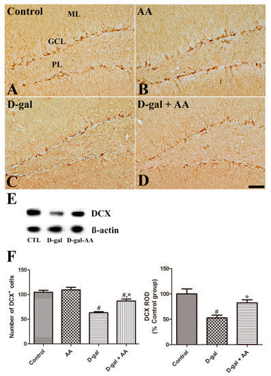 As shown in Figure 3, cell bodies of DCX-immunoreactive neuroblasts and immature neurons are observed in the subgranular zone, with well-developed dendrites extending into the molecular layer of the dentate gyrus in the control mice. The number of DCX-immunoreactive neuroblasts was not changed in the AA group compared with the control group. However, the numbers and dendritic arbor complexity of DCX-immunoreactive neuroblasts and immature neurons were significantly reduced in the D-gal alone group (Figure 3C,F); notably, the reduction was attenuated by four weeks of ascorbic acid treatment in the D-gal-AA group (Figure 3D,F). The findings by western blotting analysis are in line with those by histological staining. The protein expression levels of DCX significantly decreased in the hippocampus in the D-gal alone group, but the decrease was attenuated by ascorbic acid treatment in the D-gal-AA group (Figure 3E,F).