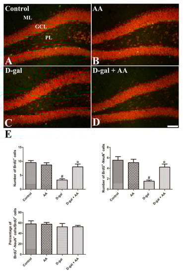 At 12 weeks of age, the animals (n = 10 in each group) received an intraperitoneal injection of 5-bromo-2′-deoxyuridine (BrdU; Sigma, St. Louis, MO, USA) at a dosage of 50 mg/kg in saline twice daily for three consecutive days to examine the effects of D-gal and ascorbic acid treatment on the differentiation of BrdU-positive cells into mature neurons in the dentate gyrus []. Animals were sacrificed four weeks after the final day of BrdU treatment for histology analysis (Figure 1).