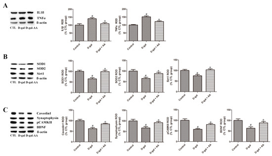 Western blot analysis of interleukin 1 beta (IL1β) and tumor necrosis factor alpha (TNFα) (A), superoxide dismutase 1 (SOD1), SOD2, and sirtuin 1 (Sirt1) (B), caveolin-1, synaptophysin, phosphorylated Ca2+/calmodulin-dependent protein kinase (pCAMK) II, and brain-derived neurotrophic factor (BDNF) (C) in the hippocampus in control (CTL), D-galactose (D-gal), and ascorbic acid (150 mg/kg; AA)-fed D-gal groups. Relative optical density (ROD) of immunoblot bands is defined as a percentage of the value of the control group (n = 7 per group; # p < 0.05, indicating a significant difference between control and D-gal groups; * p < 0.05, indicating a significant difference between D-gal and D-gal + AA groups). Data are presented as means ± SEM.
