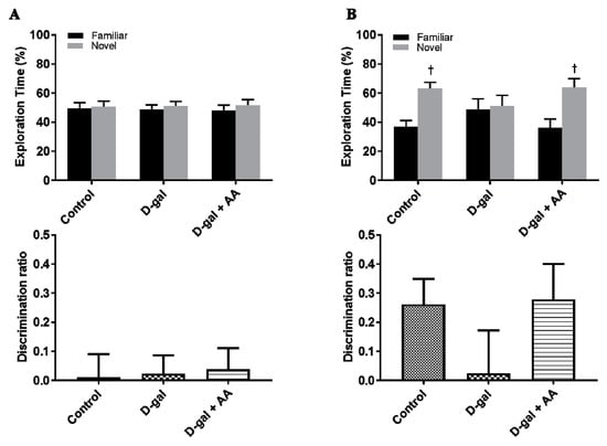 Ascorbic acid (AA) treatment ameliorates object location memory impairment in D-galactose (D-gal)-treated mice. (A) During the training phase, mice in all the groups showed no preference for two identical objects. No significant differences were found in the discrimination ratio among these three groups. (B) In the test phase, one of the two identical objects was moved into a novel location. Mice in the control and D-gal + AA groups showed a preference for the novel location over the familiar location, whereas mice in the D-gal group did not show preference between the novel location and the familiar location. The discrimination ratio in the D-gal + AA group was significantly higher than that in the D-gal group (n = 10 per groups; † p < 0.05, indicating a significant difference between familiar and novel location).