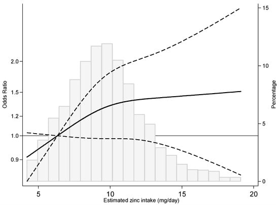 A recent meta-analysis has summarized 17 studies testing this association, showing an almost significant increase of risk among those with higher intake or higher levels (nails/hair/serum) (OR high vs. low = 1.07; 95% CI: 0.98–1.20), which is consistent with our findings []. Focusing only on studies evaluating dietary zinc, which are more comparable to ours (different bioavailability and higher doses in supplements, usually accompanied by other minerals and vitamins), the meta-analysis obtained a similar estimate (OR high vs. low = 1.05; 95% CI: 0.93–1.20) []. In addition, its dose-response trend [] was also similar to the one presented in Figure 1. It is also noteworthy to observe that the non-lineal response we found also somehow mimics the published asymptotic regression of absorbed zinc and ingested zinc [].