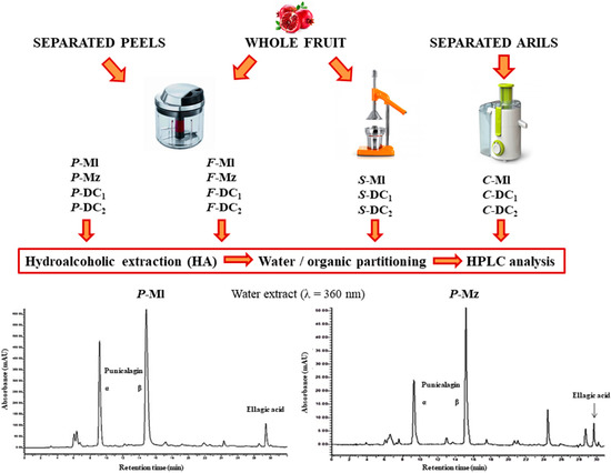 Among foods with recognized healthy properties, and belonging to plant-based diet, a dominant role is represented by the pomegranate. Fruits from Punica granatum L. represent a typical food of the Mediterranean area, with a tradition historically proven by authoritative ancient sources. Extensively used in the traditional medicine, the three parts of this fruit—the inedible exocarp and mesocarp (peels) and the edible endocarp made by pulp and seeds (arils)—are rich in interesting bioactive molecules, which have been the subjects of many studies in recent years [6,7]. In particular, pomegranate peels represent about the 50% of the whole fruit and are a rich source of phenolics, flavonoids and ellagitannins, such as punicalagins, punicalin, gallagic acid, ellagic acid and relative glycosides [8,9].