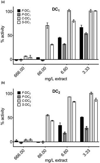 Residual activity of protein disulfide isomerase 3 (PDIA3) in the presence of (a) DC1 and (b) DC2 extracts.