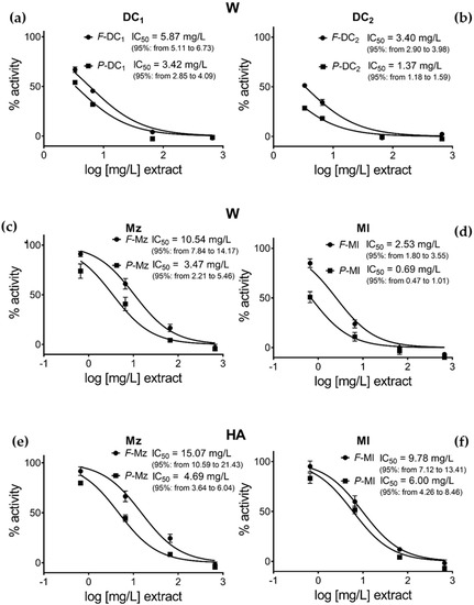 Other interesting reported evidence is the higher activity of Ml and Mz aqueous extracts compared to the corresponding hydroalcoholic ones (Figure 3c–f), with a more evident difference in Mollar cultivar. In addition, the results from the hydroalcoholic extracts confirm that the separated peels appear more active than the whole fruit as already shown for aqueous extracts (Figure 3e,f).