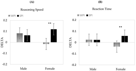 Mean change scores and 95% Confidence Intervals for Treatment × Gender interactions for Delta (A) Reasoning Speed and (B) Reaction Time. **p < 0.01.