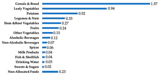 The top food groups contributing to Cd intake in the US population were cereals and bread (34%), leafy vegetables (20%), potatoes (11%), legumes and nuts (7%), stem/root vegetables (6%), and fruits (5%) (Figure 1).