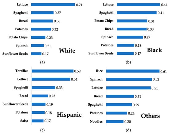 Cd contribution (µg/day/person) of top sources of dietary Cd intake among racial/ethnic groups in the US population aged ≥2 years in NHANES 2007–2012: (a) White; (b) Black; (c) Hispanic; (d) others including Asians.
