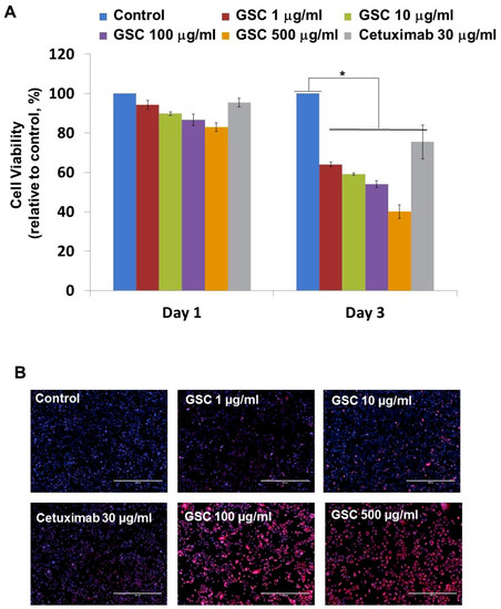 For a clonogenic assay, the cells were seeded onto a 6-well plate (1000 cells/well) [23]. After one day, the cells were treated with GSC extracts in different concentrations (1, 10, 100, and 500 µg/mL) and Cetuximab (30 µg/mL). After the 10–day cultivation, the cells were stained with a 0.05% crystal violet (Sigma) for 20 min at room temperature. The experiments were performed in triplicate.