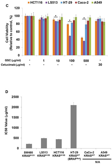 The G12V KRAS-mutated SW480, G12D KRAS-mutated LS513, G13D KRAS-mutated HCT116, KRAS-WT/v-raf murine sarcoma viral oncogene homolog B1 (BRAF)-mutated HT-29, KRAS-WT/BRAF-WT Caco-2 CRCs and KRAS-WT/BRAF-WT A549 lung cancer cells were purchased from the American Type Culture Collection (Rockville, MD, USA). Cells were maintained in RPMI-1640 or DMEM (Invitrogen, Carlsbad, CA, USA) with 10% fetal bovine serum (FBS, Invitrogen) and 100 U/mL penicillin–streptomycin (Sigma, St. Louis, MO, USA). The media was changed every 2 to 3 days with regular passage 1 to 2 times a week. Before cell seeding, cells were detached from the flasks with 0.25 % (v/v) trypsins and 0.02% Ethylene diamine tetraacetic acid (EDTA) solution. For the cell viability assay, the cells were seeded onto 96-well plates (20,000 cells/well) and treated with an increasing concentration of GSC (1–500 μg/mL) after 24 h. For proliferation analysis, 3-(4,5-dimethylthiazol-2-yl)-5-(3-carboxymethoxyphenyl)-2-(4-sulfophenyl)-2H-tetrazolium (MTS) kit (Promega, Fitchburg, WA, USA) was used, according to the manufacturer’s instructions. More specifically, the MTS reagent was added on the media for 1 hour at 37 °C and absorbance readings were taken at 490 nm (Model 550, Bio-Rad, Hercules, CA, USA).