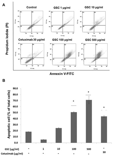 Annexin V-FITC/PI staining and flow cytometry were performed to examine GSC effects on cell death (Figure 3). Flow cytometry (FACS) analysis indicated that the GSC extract induced apoptosis in a concentration-dependent manner. For example, the GSC treatment (10 μg/mL) induced early (annexin V FITC+/PI-) and late (annexin V FITC+/PI+) apoptosis of 20.9 ± 0.23%. The apoptotic rate increased to 56.3 ± 6.07% and 72.3 ± 1.64% with 100 and 500 μg/mL, respectively.