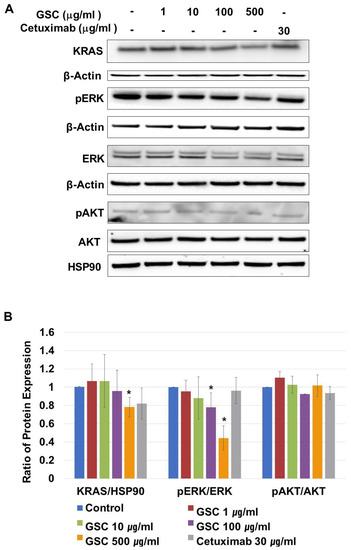 (A) Representative western blot images of KRAS, β-actin, phospho-p42/44 MAPK (phospho-ERK1/2), p42/44 MAPK (ERK1/2), phospho-AKT/AKT and HSP90 protein expression in SW480 cells treated with the GSC extract (0, 1, 10, 100, and 500 μg/mL). (B) The protein intensity was analyzed in triplicate. The ratios of KRAS/β-actin, phospho-p42/44/p42/44, and phospho-AKT/AKT were calculated. The ratios were compared with the no treatment group and significant differences are denoted by * (p < 0.05). The data are expressed as the mean ± standard error of the mean (SEM).