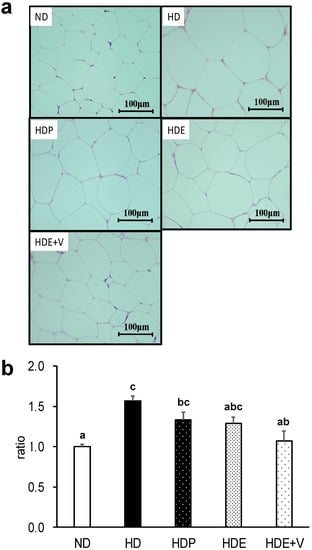 Effects of the intake of Euglena and vegetables on white adipose tissue in diet-induced obese mice. (a) Epididymal adipose tissue sections from representative mice in each group (hematoxylin & eosin, scale bar = 100 µm). (b) Adipocyte size ratio values are presented as the mean ± standard error of the mean, n = 10. a,b,c Different superscript letters indicate significantly different means at p < 0.05 (refer to “Result” in detail). ND, a group fed the normal diet; HD, a group fed the high-fat diet; HDP, a group fed the high-fat diet containing 0.3% paramylon; HDE, a group fed the high-fat diet containing 1.0% Euglena; HDE + V, a group fed the high-fat diet containing 1.0% Euglena and 0.3% vegetables.