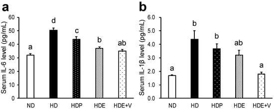 Effects of the intake of Euglena and vegetables on inflammation parameters in diet-induced obese mice. (a) Serum IL-6 level and (b) Serum IL-1β level are presented as the mean ± standard error of the mean, n = 10. a,b,c Different superscript letters indicate significantly different means at p < 0.05 (refer to “Result” in detail). ND, a group fed the normal diet; HD, a group fed the high-fat diet; HDP, a group fed the high-fat diet containing 0.3% paramylon; HDE, a group fed the high-fat diet containing 1.0% Euglena; HDE + V, a group fed the high-fat diet containing 1.0% Euglena and 0.3% vegetables.