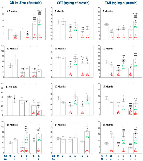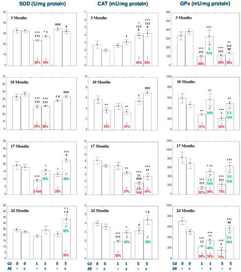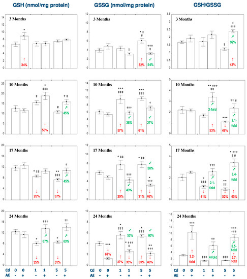 The two-way analysis of variance showed that the impact of AE administration on the concentrations of GSH and GSSG, as well as the ratio of GSH/GSSG was the result of independent action of the extract ingredients (F = 4.752–81.91, p < 0.05–0.001) and/or their interaction with this metal (F = 4.312–15.52, p < 0.05–0.001; Table S6). However, the ANOVA/MANOVA analysis revealed the lack of an independent effect of chokeberry extract and its interaction with Cd (Table S6) on GSH concentration in the Cd1 + AE group after 10 and 17 months, in spite of the clear impact of AE administration under the exposure to Cd recognized on the basis of the findings of one-way analysis of variance (Figure 3).