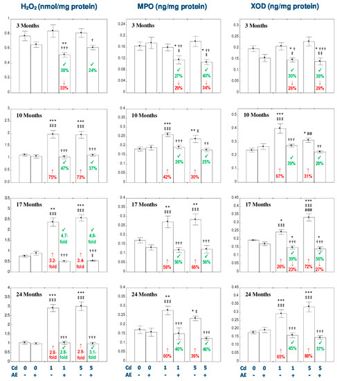 The exposure to the 1 and 5 mg Cd/kg diet increased the concentrations of MPO and XOD in this organ after 10, 17, and 24 months (by 26–88%; Figure 4), while the co-administration of AE completely prevented from this change (Figure 4). Moreover, the concentration of XOD in the Cd1 + AE and Cd5 + AE groups after 17 months was even lower (by 23% and 27%, respectively) compared to the control group (Figure 4). The consumption of the extract under the 3-month maintaining of the rats on the diet containing 1 and 5 mg Cd/kg decreased the concentrations of MPO and XOD compared to the control group (by 26–34%) and the respective group administered with Cd alone (by 27–40%; Figure 4).