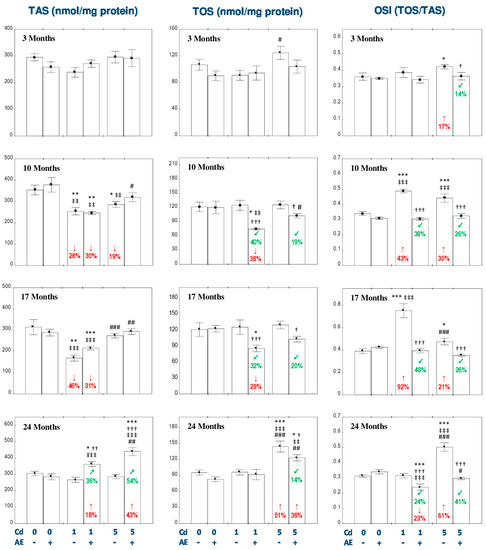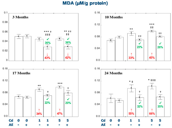 The ANOVA/MANOVA analysis showed that the effect of the consumption of AE on TAS, TOS, OSI, and MDA in the liver tissue under intoxication with the 1 and 5 mg Cd/kg diet, was the result of independent action of the extract ingredients (F = 4.519−101.2, p < 0.05−0.001) and/or their interaction with this heavy metal (F = 4.271–54.51, p < 0.05–0.001; Table S9). Nevertheless, the analysis revealed the lack of an independent effect of AE and its interaction with Cd (Table S9) on TAS in the Cd5 + AE group and TOS in the Cd1 + AE and Cd5 + AE groups after 10 months of the investigation, as well as MDA in the Cd1 + AE group after 10 and 24 months and in the Cd5 + AE group after 17 months of the study in spite of the evident impact of the extract administration under the exposure to this metal recognized on the basis of one-way analysis of variance (Figure 5 and Figure 6).