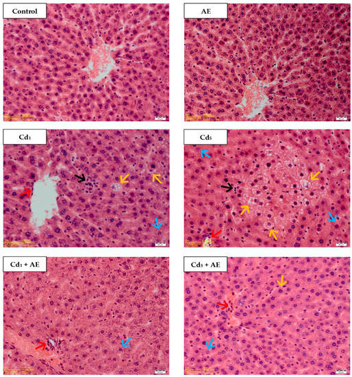 The effect of the extract from the berries of Aronia melanocarpa L. (AE) on the histological structure of the liver of rats exposed to cadmium (Cd) for 24 months. The rats received Cd in diet at the concentration of 0, 1, and 5 mg Cd/kg and/or 0.1% aqueous AE or not (H + E staining; ×400). Representative sections of the liver are presented. Control: normal liver in the control rats; AE: normal liver in the rats receiving 0.1% AE alone; Cd1 group: blurred trabecular structure—in some lobes, vacuolization and enlarged cells dimensions—in some lobes (↑), microvacuolar steatosis—in some lobes (↑), colliquative necrosis—in some lobes (↑), mononuclear cell infiltrations—in some lobes (↑); Cd5 group: blurred trabecular structure—in some lobes, vacuolization—in majority of cells, in some lobes (↑), colliquative necrosis—in some lobes (↑), microvacuolar steatosis—in some lobes (↑), mononuclear cell infiltrations—in some lobes, (↑); Cd1 + AE group: blurred trabecular structure, vacuolization and enlarged cells dimensions—in some cells in lobes (↑), mononuclear cell infiltrations (↑); Cd5 + AE group: blurred trabecular structure—in some lobes, microvacuolar steatosis—in some lobes (↑), vacuolization—in some lobes (↑), mononuclear cell infiltrations (↑).