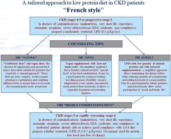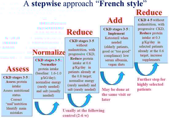 Furthermore, since in most cases the baseline dietary protein intake is high, a stepwise approach, from normalization to restriction, is established and progressively pursued (Figure 2). The patients are followed-up by the nephrology and dietetics group throughout the whole process of protein reduction; moreover, the patients who do not undergo a protein restricted diet are also followed-up to timely identify and try to compensate for the eventual signs of malnutrition. This multiple-choice stepwise approach represents an adaptation to French dietary patterns of a “diet system” previously set up in Italy, a country in which it is possible to rely on widespread acceptance of a Mediterranean baseline pattern, and reduction of protein intake is facilitated by the availability of protein-free commercial food, provided free of charge to CKD patients (Figure 3) [,,].