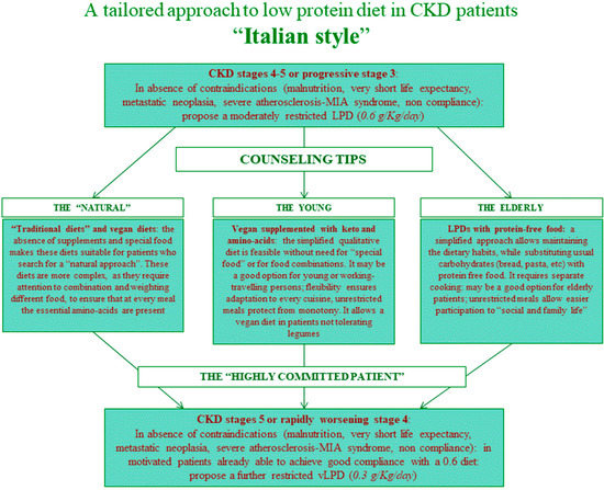 Furthermore, because of low adherence to dietary recommendations, doctors often decide not to prescribe them, in particular for patients in which the cause of renal failure is linked to dietary habits, as is often the case in obese patients or those with type 2 diabetes [,,,]. In particular, in the elderly, or diabetic and obese patients, baseline dietary habits are considered to be extremely difficult to change, thus reducing the acceptance of protein restriction. Likewise, Mediterranean countries, such as Italy, where low-protein diets are a part of the routine management of CKD patients, are usually thought to be favored by baseline patterns, unlike other areas of Europe, including central and northern France, where the present study was performed [,,]. In these settings, as well as in the United States or Australia, the generally higher protein intake in fact makes it difficult to convince patients of the need to follow protein-restricted diets [,,,,].