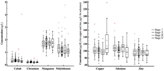 Concentrations of the seven trace elements were compared between breast cancer patients with and without lymph node metastasis, and no significant differences were found in the discovery cohort (Table 2). In the discovery cohort, among seven trace elements, data for Mn and Zn in patients with and without lymph node metastasis were normally distributed and other data were not. In the validation cohort, data for Cu and Zn in both patients with and without lymph node metastasis and Co and Se in patients with lymph node metastasis were normally distributed. Other data were not normally distributed. Concentrations of the seven trace elements were compared among breast cancer patients in different stages. No significant differences were observed in seven trace element levels among breast cancer patients at different stages. However, among the seven trace elements, concentrations of Cu were significantly higher and concentrations of Se were significantly lower in women with stage IV breast cancer in the discovery cohort (metastatic breast cancer, Figure 1 and Table 2). In the discovery cohort, among seven trace elements, data for Mn and Zn in patients with and without stage IV breast cancer were normally distributed and data for the others were not. No breast cancer patients with stage IV breast cancer were enrolled in the validation cohort.
