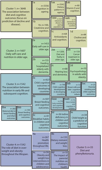 Topic analysis of the five main clusters and 30 sub-clusters reveal several insights into the landscape of the literature addressing lifestyle dietary intervention to improve cognition (Figure 2; Supplementary Tables S1–S5). Broadly, clusters form around lifespan stages: Two clusters focus on older age (cluster 1: The association between diet and cognitive outcomes with a focus on the prediction of decline and disease; cluster 2: Daily self-care and nutrition in older age), two on lifespan or midlife (cluster 4: The role of diet in overweight and obesity throughout the lifespan; cluster 5: Diet and phenylketonuria), and one in childhood (cluster 3: The association between nutrition in early life and subsequent cognition). There are clear sub-literatures within larger topics, e.g., maternal diet and breastfeeding outcomes (3ba) within breastfeeding and cognitive outcomes (3b) and within the association between nutrition and early life and subsequent cognition (cluster 3). Yet, the tendency for publications to cluster around the time of life precludes what might be considered logical sub-cluster groupings. For example, due to conceptual similarities, one might expect sub-clusters relating to antioxidants, choline, trace metals such as magnesium and iodine to fall within close proximity. However, they are more specific to the adult-specific cluster 1 (antioxidants 1c; choline 1d) and child-specific cluster 3 (magnesium 3aab; iodine 3d).