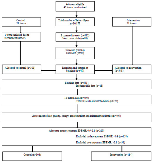 To strengthen the association between diet and health outcomes, and to reduce the variability in results, energy misreporters were identified and excluded from the final analysis [43]. Each participant’s total energy intake (EI) was divided by their basal metabolic rate (BMR), calculated using the Schofield equation relevant to their age, sex, and weight [44]. Based on prior recommendations, the Goldberg cut off values were applied to identify energy misreporters; <0.9 for low energy reporters, and >2.1 for high energy reporters [45,46]; thereby, adequate energy reporters (EI/BMR 0.9–2.1) were included in the final analysis. Statistical analyses were conducted with Stata Statistical Software: Release 12.1 (StataCorp LLC, College station, Texas, USA) [47], with a two-sided significance level. A statistical analysis plan was followed under the direction of an experienced biostatistician. Baseline characteristics of all participants were analyzed using cluster adjusted t test for continuous variables and cluster-adjusted chi square tests for categorical variables. Linear regression was used to assess the difference between groups from baseline to 12 months. Within-group differences over the study period were analyzed by using paired t-tests for continuous variables, and chi-square tests for categorical variables adjusted for group allocation (intervention/control), town clustering, and baseline values of interest. The change in all outcome variables (diet quality and its components, macronutrient and micronutrient intake, and the change in weight) were calculated as 12 months minus the baseline data, and were analyzed by using linear regression analysis (continuous outcomes). A logistic random-intercepts model was used for dichotomous outcomes (whole milk: low-fat milk and saturated fat components)) to account for the measurement at two time points (baseline and 12 months). All analyses were adjusted for group allocation (intervention/control), town clustering, and baseline values. Outcomes were adjusted a priori for factors known to influence diet quality, including age (years), BMI, smoking (yes/no/occasionally), employment (full-time, part-time, no paid work), marital status (not married, married), education (no post school qualification, certificate/diploma/apprentice, bachelor degree and above), income level (Australian Dollar AUD 40,000 or less, Australian Dollar AUD 41–64,000, Australian Dollar AUD 65–80,000, Australian Dollar AUD more than 81,000), group status (intervention/control), and town clustering.