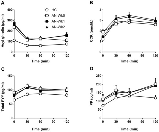 - Nakahara, T.; Kojima, S.; Tanaka, M.; Yasuhara, D.; Harada, T.; Sagiyama, K.-I.; Muranaga, T.; Nagai, N.; Nakazato, M.; Nozoe, S.-I.; et al. Incomplete restoration of the secretion of ghrelin and PYY compared to insulin after food ingestion following weight gain in anorexia nervosa. J. Psychiatr. Res. 2007, 41, 814–820. [Google Scholar] [CrossRef] [PubMed]