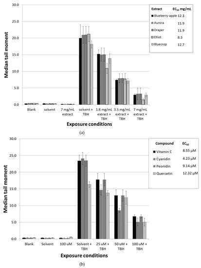 Level of DNA damage in Caco-2 cells as measured by the alkaline comet assay, expressed as average median tail moments. Error bars indicate standard deviations. Caco-2 cells were pre-incubated for 2 h with different concentrations of the extract of blueberry–apple juice or extracts of four different blueberry varieties (a), or single compounds (b) and subsequently exposed to 100 µM tert-butylhydroperoxide (TBH) for 1 h. Next, DNA strand breaks were measured using the alkaline comet assay. Pre-incubation for 2 h with medium, solvent control (0.5% end concentration of 70% methanol/0.1% formic acid), the highest concentration of the different extracts (i.e., 7 mg/mL), or 100 µM of single compounds did not induce any DNA damage. A dose-dependent decrease in DNA damage was observed for all blueberry extracts and single compounds tested (ANOVA, P < 0.01). In order to investigate which of the blueberry extracts and single compounds possessed the highest chemopreventive properties, linear log regression was applied. From the log linear regression equation, the EC50 was estimated which is shown in the legend.