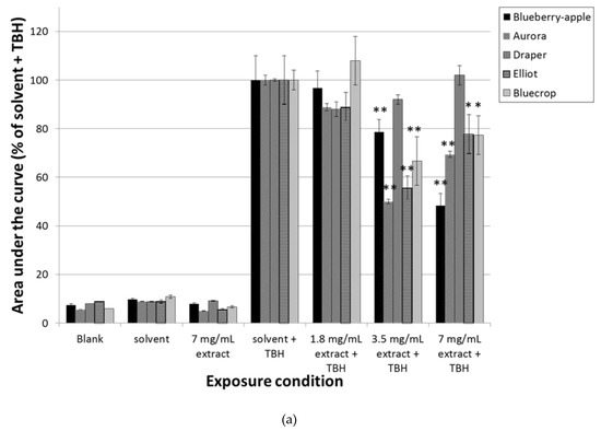 In order to get more insight into the chemopreventive mechanisms of the different blueberry extract and single compounds, Caco-2 cells were also pre-incubated for 2 h with different concentrations, and subsequently challenged for 30 min with 150 µM TBH after which free radical formation was measured by ESR spectroscopy. The extract of blueberry–apple juice was able to dose-dependently decrease the formation of free radicals (P < 0.01) (Figure 2A,B). In addition, the extracts of Elliot, Aurora, and Bluecrop were able to reduce the generation of free radicals, but only at a concentration of 3.5 mg/mL and 7 mg/mL (P < 0.01). Draper was not able to diminish the amount of free radicals after pre-incubation and subsequent exposure to TBH.