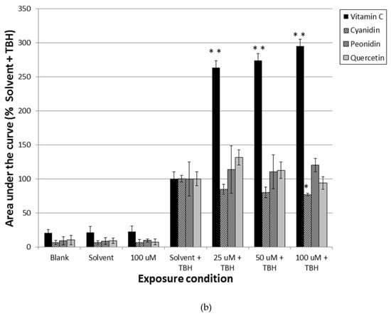 After pre-incubation, a subset of cells was challenged with the oxidant tert-butylhydroperoxide (TBH) (Sigma Aldrich, Zwijndrecht, The Netherlands). For Comet assay experiments, Caco-2 cells were challenged with 100 µM TBH for 1 h, as this exposure condition resulted in cell viability levels > 80%, and a moderate increase in oxidative DNA damage (Figure S1). The optimal exposure condition of Caco-2 cells in the ESR spectroscopy measurements was determined at 150 µm TBH for 30 min as at this condition cell viability levels were >80% and a significant increase in free radical formation was observed. Experiments were carried out in triplicate (Figure S2). After exposure, cells were washed twice with 1 mL Hank’s Balanced Salt Solution, without Ca and Mg (HBSS, Life Technologies, Leusden, The Netherlands), isolated by trypsinization, resuspended in 1× PBS and subsequently placed on ice. For gene expression experiments, cells were lysed in the culture dish using TRIzol® Reagent (Invitrogen, Breda, The Netherlands), and stored at −20 °C until use.